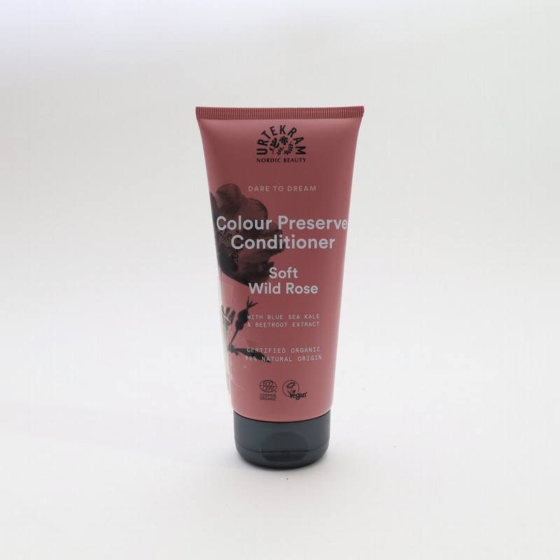 Urtekram Colour Preserve conditioner, moisturizing and colour protecting for coloured hair. Mild formula with hydrating aloe vera, colour protecting blue sea kale and beet root extract nourish your hair, add softness, shine and make it easy to brush. Apply to damp hair and rinse. With a fresh scent of delicate wild rose. nIngredients: nAqua, Aloe Barbadensis Leaf Extract*, Glycerin**, Cetyl Alcohol, C15-19 Alkane, Distearoylethyl Dimonium Chloride, Cetearyl Alcohol, Cocos Nucifera Oil*, Rosa Canina Fruit Extract*, Rosa Damascena Flower Extract*, Simmondsia Chinensis Seed Oil*, Beta Vulgaris Root Extract, Crambe Maritima Leaf Extract, Magnolia Officinalis Bark Extract, Beta-Sitosterol, Squalene, Butylene Glycol, Fructooligosaccharides, CI 77491, Mica, Glyceryl Stearate SE, Tocopherol, Lactic Acid, Potassium Lactate, Glyceryl Caprylate, Parfum, Geraniol, Limonene. (* = ingredient from organic Farming, ** = made using organic ingredients). 15 % organic of total. 59 % organic of total minus water and minerals. 99 % natural origin of total. COSMOS ORGANIC certified by Ecocert Greenlife according to COSMOS Standard.